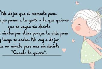 No dejes que el momento pase. No dejes pasar a la gente a la que quieresque se vayan sin decirle lo que sientes por ellas porque la vida pasa y luego se acaba.No voy a dejar que un minuto pase mas sin decirte "Cuanto te quiero".❤