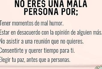 Estamos en una sociedad en la cual por todo somos juzgados, son muchas las personas que de una u otra forma quieren que actuemos de cierta forma y lo cierto es que una gran parte de esas cosas no serán para nada de nuestro agrado, tenemos dos opciones: seguirles la cuerda aun contra nuestra voluntad y quedar como personas agradables o reusarnos a hacer lo que otros quieren corriendo el riesgo de quedar como malas personas.Si se trata de agradarle a todo el mundo esto es algo imposible, aun si tratas de complacer a cuanta persona que pida algo de ti, lo cierto es que aun si das lo mejor de ti para quedar bien con ella siempre habrán algunos que no valoran tu esfuerzo, que solo se interesan por aprovecharse de ti o que muchas veces tan solo no están conformes con nada.Como es una perdida de tiempo tratar de complacer a otras personas lo mejor es ser tu mismo y actuar conforme a tu voluntad, no tienes porque fingir estar bien ante otros cuando no es así, no tienes porque estar en un circulo social en el cual no te sientes cómodo, no tienes porque callar tu opinión por miedo a desaprobaciones, no esta mal que pienses en ti y busques lo que mejor te hace sentir.No eres una mala persona por no ser lo que otros quieren que seas, no eres una mala persona porque querer un tiempo de soledad, eres una persona que antes que nada debe ser feliz consigo mismo para así cuando llegue el momento de interactuar con una sociedad no dejes de ser quien eres, no permitas que otros quieran cambiarte y sobre todo no llegues a lugares donde no estés a gusto.