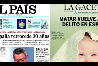 Hoy toca el turno a la maternidad, una potestad que se ha arrancado a la mujer a golpe de decreto neolítico. Poco puedo añadir sobre este asunto y su repercusión en los medios de comunicación. El diario La Gaceta titula hoy: “Matar vuelve a ser delito en España”; por su parte, con un “Aborto: España retrocede 30 años”, El País se coloca en el otro extremo. El primero, igual que La Razón, recurre de manera repugnante a la utilización de la imagen de menores con síndrome de Down; el segundo se limita a reproducir una fotografía del ministro de Justicia, Alberto Ruiz-Gallardón. Dos puntos de vista diametralmente opuestos e incluso me atrevería a decir que si las palabras pudieran pegarse patadas o declararse la guerra, estos dos titulares estarían ahora mismo matándose el uno al otro. Porque en este asunto, como en ningún otro, la ultraderecha carga su demagogia con mucho, mucho odio. Ya no se trata de una cuestión meramente ideológica, de un debate que podamos resolver sentándonos a hablar; se trata de que yo, tú y aquellos y aquellas que pensamos que el ser humano no comienza justo en el momento de la fecundación estamos promoviendo el asesinato.