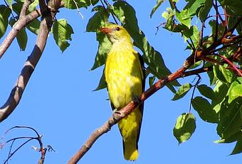 No resulta fácil ver a las oropéndolas a pesar de su llamativo plumaje amarillo. En este caso es una hembra.