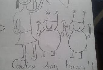 De repente vieron unas piedras que se acercaban, eran muchas, muchísimas ¡eran asteroides! Menos mal que los esquivaron todos. Después vieron un planeta redondo, parecido a la tierra. Cuando aterrizaron había mucha vegetación y agua, de repente vieron unas casas, también se les acercó un extraterrestre. Era bajito y regordete, tenía los ojos como antenas y una boca muy grande, no tenía nariz y era de color rojo. De repente vino otro igual solo que de color amarillo, entonces descubrieron que podían hablar con ellos porque hablaban español. Les preguntaron que qué hora era pero ellos no sabían lo que era una hora, segundo, día mes y año. Los extraterrestres se llamaban Jony y Harry y les dijeron de donde venían, les contestaron que venían de la tierra y que en qué planeta estaban. Les dijeron que estaban el en planeta Verenjuelo de la galaxia Verdurín. Los extraterrestres les dijeron que nunca habían oído hablar de ese planeta y que cuando se iban a ir. Los extraterrestres les invitaron a quedarse a dormir y ellos aceptaron.