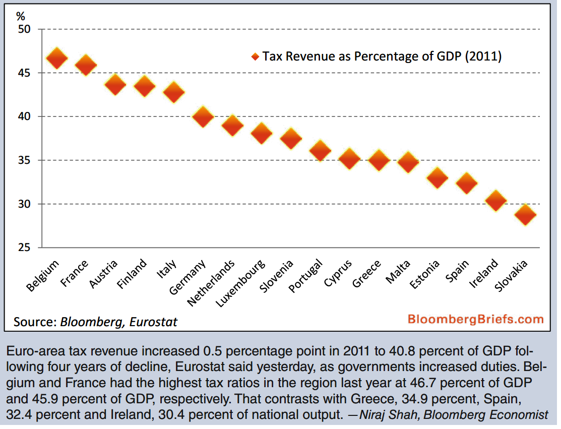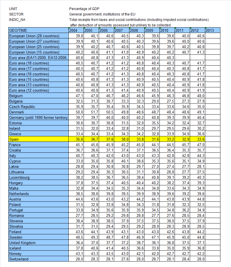 a) los ingresos fiscales se desplomaron en los primeros años de crisis, -la caída del Impuesto de sociedades fue brutal- en conjunto no se recuperan, teniendo España una de las menores recaudaciones de impuestos de Europa, como muestra el gráfico superior, situación que continúa hoy a pesar de las 40 subidas de impuestos del Gobierno Rajoy. El voluntarismo no resuelve los problemas, que cuanto mayores son, mas necesitan de acuerdos entre todas las fuerzas para lograr resultados positivos y hoy conseguir mayor recaudación es un grave problema que no resolverá un solo partido.