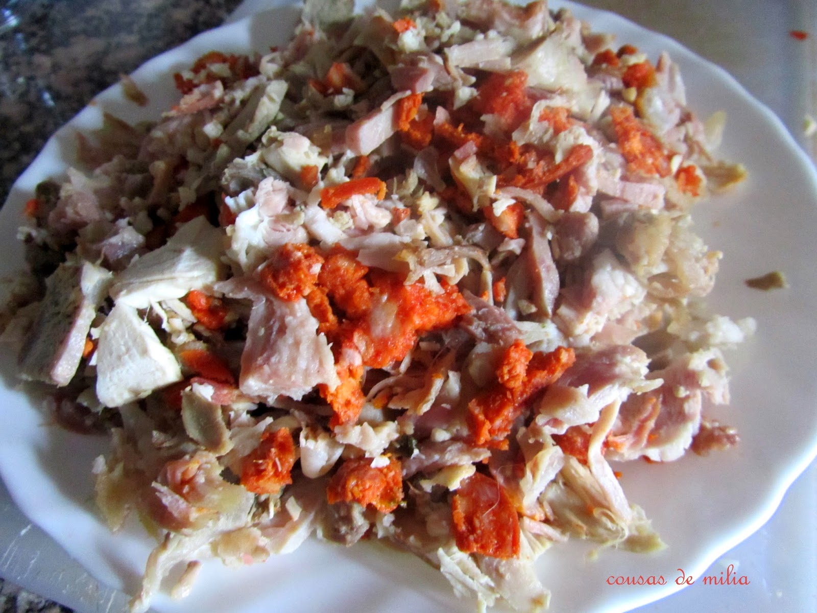 En casa hay unos cuantos platos estrella que curiosamente son reciclados, aunque tengo que confesaros, que hago un poco de trampa "...pongo un poco de más para que sobre..." Nuestros niños de pequeños el día que había cocido, comían fatal, nunca se lo reproché, porque yo, hacía lo mismo "...solo aprecié el cocido después de pasarme una temporadita en una residencia de monjas, es más... ¡hasta lo añoré...! Por tanto cuando este plato triunfó entre ellos, la primera sorprendida fui yo, y siempre recuerdo con una sonrisa...aquello de " ¡dame más, que esto está muy bueno!" y " ¿no me digas que es de cocido?" Las frases en cuestión son de la hija de mi marido, en aquel momento una niña muy guapa, con unos ojos muy grades y muy pizpireta, atributos que sigue conservando ahora que se ha convertido en madraza de un precios niño y que está a punto de traer a la familia una niña, género muy excaso en los últimos tiempos, los pocos que nacen son niños ¡que tengas una buena hora corazón!Después de esta introducción ya os imaginaréis que este es otro plato surgido de aquel suculento cocido... otro "xa te vin" (ya te vi) que pasa totalmente desapercibido como tal... Y os aseguro que de este no sobra nadita... hasta los platos quedan inmaculados.