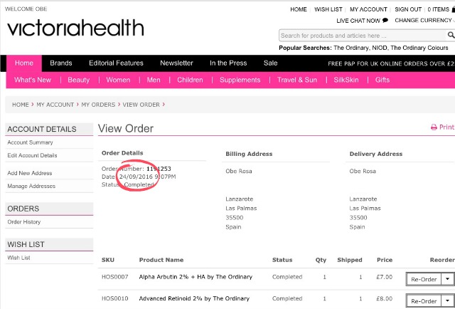 Probablemente el exceso de publicaciones en RRSS como Instagram hablando de la marca produjeron en mí un hartazgo considerable y no me apeteciera hablar de la misma. Pero que conste que llevo testando la marca desde hace exactamente un año cuando aún no había ni llegado a España y mi primer pedido lo hice a través de una web inglesa, tal y como queda reflejado en la imagen inferior.