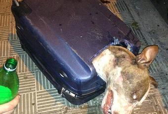 el agujero que la perra tiene la cabeza lo hizo ella misma mordiendo para poder respirar