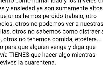 Acabo de ver esta imagen en la cual se dice que no tenemos porque hacer algo para aprovechar la cuarentena, pues que muchos hemos tenido grandes inconvenientes a raíz del aislamiento por lo cual es comprensible el no tener cabeza para hacer cosas provechosas, si bien es cierto que no debemos presionarnos tanto ni presionar a otros, también es cierto que este mensaje es mediocre.Claro que la gran mayoría de personas en estos momentos debe tener muchas preocupaciones, ansiedad, depresión y un sin fin mas de cosas pasaran en su cabeza, pero ¿que es mejor: quedarnos acostados todo el día pensando en las cosas malas que han pasado y que pueden pasar o aprovechar el tiempo de la forma que nos sea posible? hacer lo primero solamente nos enfermara hacer lo segundo puede que no arregle nuestros problemas pero esto nos ayudara a evitar pensar tanto en lo que nos atormenta, relajarnos y prepararnos mejor para afrontar lo que este por venir después de la cuarentena.No tienes porque pasar todo el día estudiando, leyendo, haciendo ejercicio o demás, pero si puedes destinar una parte de tu tiempo en el día para hacerlo, si tienes un hijo demuéstrale que puedes lidiar con tus temores en lugar de permitir que estos te dominen, dale un buen ejemplo, el tener en tu mente un montón de preocupaciones no es excusa pues todos las tenemos, hay un viejo dicho que dice: Si un problema tiene solución no hay de que preocuparse y si no tiene solución tampoco sirve de nada preocuparse, deja de arruinar tu salud mental y física a raíz del problema actual, aprovecha tu tiempo y no porque otro lo dice sino por tu bienestar y el de tu familia.