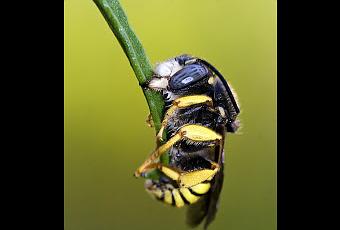 "El género Nomada presenta una amplia distribución mundial. Son abejas de hasta 10 mm. de longitud, cleptoparásitas de otras abejas, avispas y abejorros. Es decir, depositan su puesta en la pared de las celdillas de las especies citadas, actuando su larva como parásita. Al carecer de nidos, duermen de la peculiar forma que se ve en la imagen. Muerden un pequeño tallo de hierba y se quedan colgando del mismo."