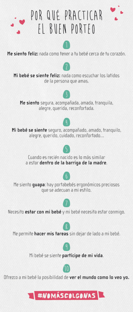 Este movimiento lo empezamos en twitter y nació de las ganas de compartir los conocimientos del porteo del bueno. Nos duele ver padres entusiasmados y con ganas de llevar a sus bebés, pero que por desinformación (y engaño deliberado de las marcas colgonas) acaban con un portabebés no ergonómico en sus manos. Iremos colgando motivos a favor del porteo del bueno y informaciones varias sobre porteo.