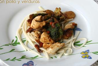 - En una sartén amplia o wok pon aceite a fuego vivo.Saltea las verduras y luego añade las tiras de pollo.