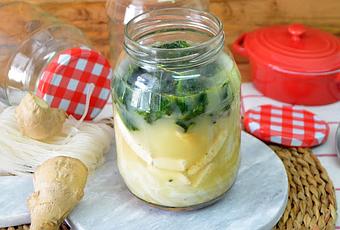 Primero añadimos la salsa de soja, el jengibre, luego los noodles de pollo, las espinacas, el pollo troceado, y por ultimo añadimos el caldo de pollo o verduras, según hayáis elegido, cerramos.