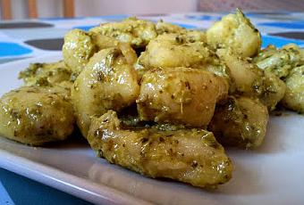 Ahora tendréis que ir haciendo churros con la masa, como los que hacíamos con plastilina cuando éramos unos críos en la guardería, exactamente igual. El diámetro debe quedarse entre un centímetro y medio y dos centímetros, para que luego pueda cocerse bien. Coged un cuchillo e id cortando trozos de unos dos centímetros de largo. Ahora sólo os queda cocerlos en abundante agua. Echadlos cuando el agua hierva con fuerza. Cuando floten estarán listos para sacar.Podéis acompañar los ñoquis con lo que queráis, con salsa barbacoa, con tomate, queso, lo que sea, todo le queda bien a esta pasta. Yo opté por ponerle un par de cucharadas de la salsa pesto que me sobró del sándwich de aguacate.Enjoy!