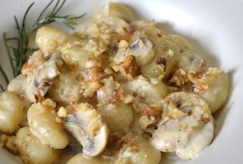 Poner una cazuela con agua para cocer los ñoquis, en unos 3 minutos están listos. Sacar y escurrir, reservar.En una sartén poner un poco de aceite, pelar y picar fino el ajo, echar a la sartén y dejar que se haga a fuego medio sin que llegue a dorar,añadir los champiñones en láminas y dejar hacer 7 minutos. Verter la nata y añadir el queso en trozos, remover hasta que se haya mezclado todo bien y el queso se haya derretido, salpimentar. Verter los ñoquis en la sartén y mezclar. Poner las nueces en un mortero y machacar un poco, añadir a la sartén dar una vuelta y servir.