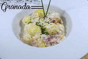 Se deja hacer hasta que esté dorado entonces se agrega la nata, sal y pimienta al gusto y se deja que reduzca unos minutos mientras se cuecen los ñoquis según indicaciones del fabricante.
