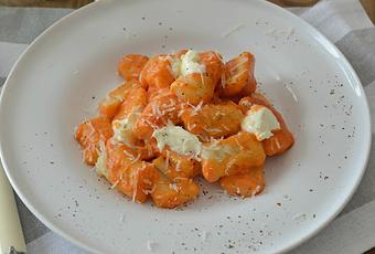 Una vez tenemos la salsa lista ir añadiendo los ñoquis a la cazuela con el agua hirviendo. En cuanto floten sacar no esperes a que floten todos. Ir poniendo en un plato. Mezclar los ñoquis con la salsa con cuidado de no romperlos.