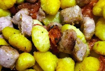 En un recipiente acto para la airfryer poner los ñoquis, las salchichas y los tomates.