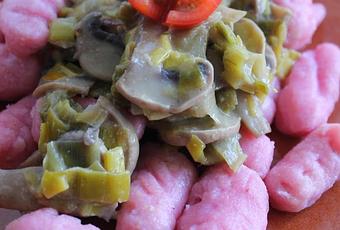 - 500 gr de patata cocida al vapor. - 100 gr de tofu ahumado - 150 gr de harina integral de arroz. - 1 c de sal marina - 2 C de zumo de remolacha (opcional). - ¼ c de nuez moscada.Para la salsa: - 1 puerro. - 300 gr de champiñones. - 200 ml de crema de arroz para cocinar (también puede ser de otro tipo). - 2 C de levadura nutricional. - 1 pizca de pimienta negra molida. - Aceite de oliva y sal.