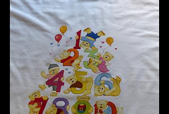 Retomando un dibujo que hace mucho que no usaba, pinté este nórdico para cuna.Petición especial de la mamá, pues a su hermano hace ya X años se lo pinté tambien en una sábana.Números y osos divertidos y coloristas.