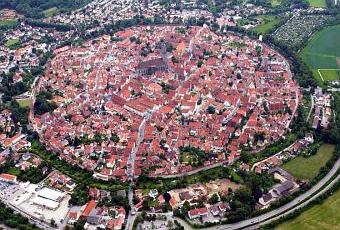 La ciudad bávara de Nördlingen es quizá el mejor recinto amurallado circular que se conserva. La circunferencia es el perímetro que maximiza el área interior. Como la forma de las murallas está condicionada por la orografía es raro encontrar un ejemplo tan perfecto. La muralla es, además, accesible para ser recorrida en su totalidad.
