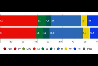 El gobierno conservador de Erna Solberg mantendría la mayoría con los nacionalistas como principal socio. Los conservadores de Hoyre retrocederían casi 3 puntos, mientras que la extrema derecha sumaría más de dos puntos. Juntos conseguirían el 42,6% de los votos más el 9,2% de los otros dos partidos del centro-derecha, el KrF y Venstre.