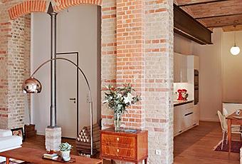 Un hogar con grandes ventanales, ladrillos especialmente bonitos, techos abovedados y vigas de hierro fundido. Una gran cocina abierta, con una encimera de mármol blanco que combina a la perfección con la mesa de madera rústica que invade la misma. El salón custodiado por unos muros preciosos de ladrillo, un sofá de lo más sencillo y una perfecta alfombra de killim que da la calidez necesaria a este espacio tan industrial.