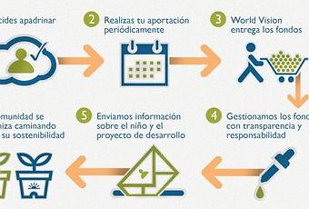 Puedes elegir un niño o una niña y convertirte en su madrina aportando una pequeña cantidad periódica a World Vision, quien entrega los fondos a la comunidad donde vive el menor, y se compromete a daros información sobre vuestro ahijado o ahijada y su comunidad, y a ser transparentes sobre la gestión de los fondos.