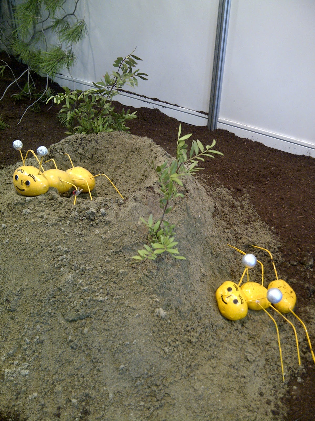 És curioso, porque ese comentario me ha desautomatizado de golpe y me ha hecho pensar en las hormigas de la exposición agro-alimentaria de la Fira de la Puríssima de Sant Boi, del pasado mes de diciembre. Eran unas hormigas hechas con tres patatas pintadas de amarillo y unos palillos en forma de patitas y otros dos de antenas. Con la carita sonriente y dispuestas sobre unas montañitas de tierra.