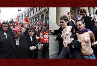 Pero el titular del diario El Mundo, del mismo día, tampoco se corta un pelo: "Las jóvenes españolas cada vez más divididas ante el aborto" o "boicot frustrado a la marcha antiabortista en Barcelona". Si en la fotografía de El país las protagonistas eran unas monjas en uniforme talar, en esta otra el tejido escasea y la edad se acorta. Unas féminas espolvorean sus torsos tatuados para solaz del respetable, mientras que los Mossos recogen como pueden el vestuario y conducen a estas señoritas de Avignon a dependencias más discretas.