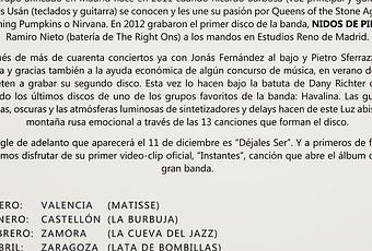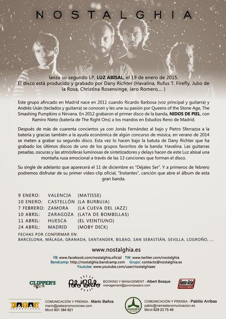 MÁS CITAS CON NOSTALGHIA30 de Enero: Fnac San Agustín (Valencia)- 31 de Enero: Fnac Diagonal Mar (Barcelona)- 13 de Febrero: Fnac Principado (Asturias)- 14 de Febrero: Fnac Coruña- 12 de Marzo: Fnac Marbella- 13 de Marzo: Fnac Málaga- 20 de Marzo: Fnac Parquesur Madrid- 09 de Mayo: Fnac Plaza Norte Madrid- 14 de Mayo: Fnac Donosti-15 de Mayo: Fnac Bilbao- 23 de Mayo: Fnac Castellana Madrid- 13 de Junio: Fnac CallaoY su primer video-clip que se estrenó en exclusiva hace dos meses en MONDOSONORO: http://youtu.be/OACkUE9kjNkEstas semanas ya está rotando en MTV y SOL MUSICA con 24 pases, una pasada! Llevan ya 8 semanas en estos canales!Facebook: https://www.facebook.com/nostalghia.oficial?ref=bookmarksSpotify: https://player.spotify.com/album/1xKjCtGZVXOTfMexWZm1voTwitter: https://twitter.com/nostalghiaBandcamp: https://nostalghia.bandcamp.com/Email: [email protected]Contacto comunicación: MI CORREOWeb: www.nostalghia.esInstagram: https://instagram.com/nostalghiaes/Revista Arte