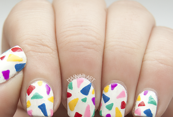 También os podéis ayudar con nail tapes, pero eso implica mucho mucho tiempo de secado -imprescindible- y paciencia para colocar las cintas. Yo empecé con cintas, para no mentiros, pero cuando hice una uña me arrepentí :P Los triángulos no quedan perfectos, pero a simple vista no se nota :)