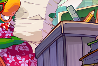 ¡Hola! ¡En la portada del periódico se puede ver como encabezado “Todos a clase” dando una referencia a la nueva Fiesta de Escuela y Skate en Club Penguin, aqui se ve a Rookie, explicandonos un proyecto de construcción de escuelas que se está dando gracias a este divertido juego.