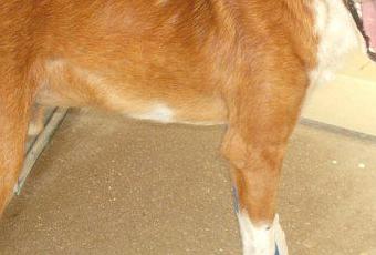 Muchas costras en las orejas por las garrapatas que traia, Herida profunda en EAI con pérdida de tejido blando, y exposición de hueso, el tejido de granulación tiene buen aspecto, pendiente de valorar por Alberto.