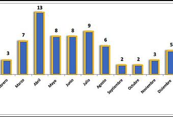 Distribución mensual de caídas de cohetes en el territorio de Israel