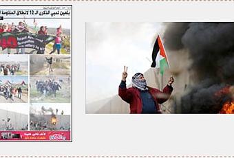 A la derecha: Quema de neumáticos cerca de la valla de seguridad en Bil”in (WAFA, 17 de febrero de 2017). A la izquierda: Una pagína del periódico al Hayat al Jadeeda, dedicada a conmemorar el 12 aniversario del comienzo de la actividad de “la resistencia popular” en Bil”in (al Hayat al Jadeeda, 18 de febrero de 2017)