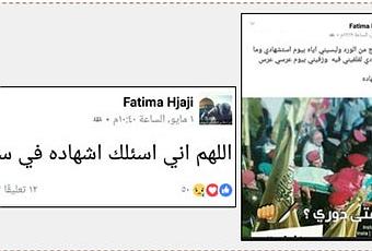 A la derecha: Un anuncio presentado por Fatima Hjaji el 5 de mayo de 2017 mostrando un funeral militar. En la fotografía se lee: “Y cuando llegue mi turno?”. La terrorista escribe en el anuncio las palabras siguientes: “Oh madre mía, prepárame una corona de rebeldes y ponla en mi cabeza el día de mi muerte. No te olvides de envolverme en la bandera de mi patria, y conducirme como si fuera una novia el día de mi casamiento, casamiento de la mártir #te quiere la mártir “Fatima” (página facebook de Fatima Hjaji, 5 de mayo de 2017). A la izquierda: Anuncio presentado el 1 de mayo de 2017 en el que escribe: “Allah, yo te pido morir para tí, una muerte de santos” (página facebook de Fatima Hjaji, 1 de mayo de 2017)