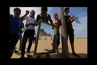 Derecha: manifestantes en Gaza preparando catapultas para arrojar piedras contra las fuerzas de las FDI (página de Al-Risala en Facebook, 6 de abril de 2018). Izquierda: manifestantes en Gaza preparando espejos para deslumbrar a los soldados de las FDI. (página de Al-Risala en Facebook, 2 de abril de 2018).