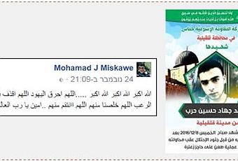 A la derecha: Cartel de duelo publicado por Hamás en el distrito de Qalqiliya por la muerte de Muhamad Harb (sitio de radio al Aqsa, 9 de diciembre de 2016). A la izquierda: El aviso puesto por Muhamada Miskawe en su página facebook en la que expresaba alegría por los incendios en Israel (página fadebook de Mohamada J Miskawe, 24 de noviembre de 2016)