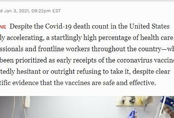 Traducción A pesar de que el recuento de muertes de Covid-19 en los Estados Unidos se está acelerando rápidamente, un porcentaje sorprendentemente alto de profesionales de la salud y trabajadores de primera línea en todo el país -a quienes se ha dado prioridad como receptores tempranos de la vacuna contra el coronavirus-, según se informa, dudan o se niegan rotundamente a tomarla, a pesar de que existen pruebas científicas claras de que las vacunas son seguras y eficaces.