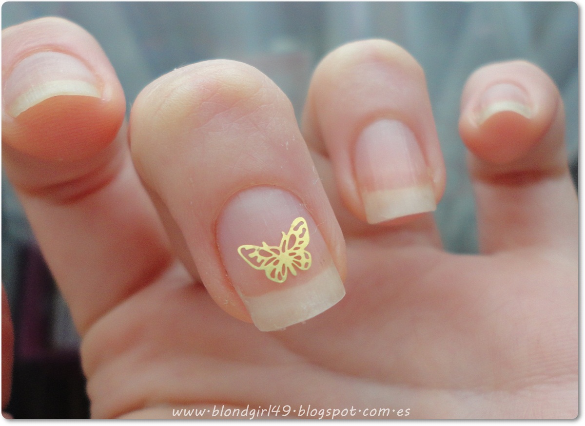 Estos son los 12 diseños que vienen, viéndolos juntos os podéis hacer una idea del tamaño que tienen^^ y a continuación os enseñaré una foto en el que he puesto la mariposita sobre la uña para que veáis el tamaño, pero tened en cuenta que yo tengo las manos bastante peques (y por lo tanto las uñas también).