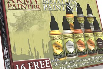 Nos hemos enterado por On Tabletop (Beasts of War) que la marca danesa The Army Painter va a sacar a la venta un set de 8 botes de pintura metálica hacia mediados del mes que viene (Sobre el 14 de marzo). Son 8 botes de 18 ml teóricos, con tapón de rosca y dosificador de goteo, cada uno de un color metálico diferente, con lo que tenemos todo lo necesario para pintar cualquier tonalidad metálica de una figura.
