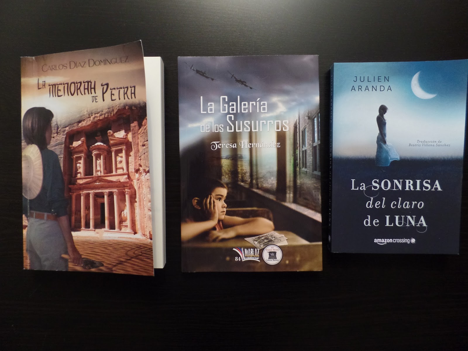 La menorah de Petra de Carlos Díaz Domínguez (Autoeditado). Enviado por su autor y es uno de los que ya está leído y reseñado en el blog (Reseña de La menorah de Petra)La galería de los susurros de Teresa Hernández (Libros Mablaz). Este también lo he conseguido a través de un sorteo, en este caso en el blog Un lector indiscreto.La sonrisa del claro de luna de Julien Aranda (Amazon Publishing). Un título que me ofrecieron desde la editorial y que tiene muy buena pinta.¿Qué os parecen? ¿Habéis leído alguno o tenéis previsto hacerlo?