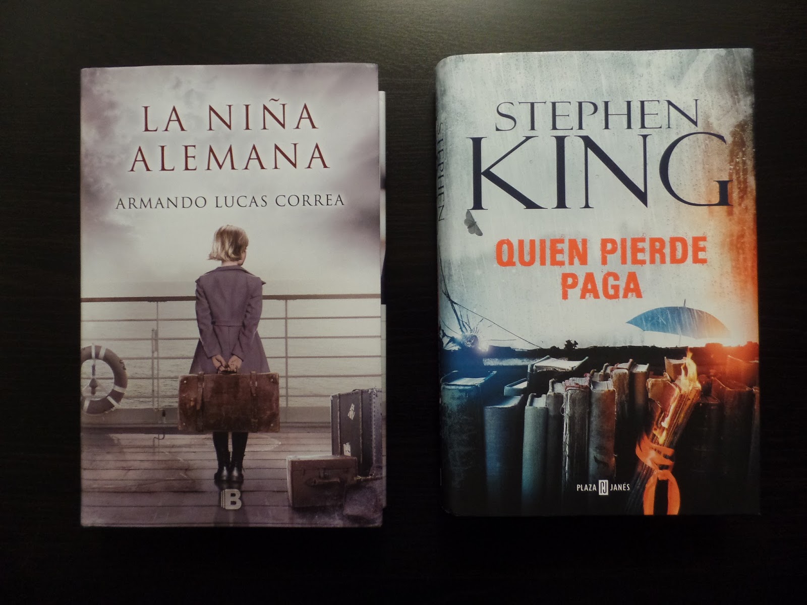 La niña alemana de Armando Lucas Correa (Ediciones B). Me había fijado en este libro cuando lo vi entre las novedades de la editorial por lo que cuando me ofrecieron un ejemplar no dudé en aceptar. Ya está leído y la reseña casi lista, así que en breve espero hablaros de él.Quien pierde paga de Stephen King (Plaza & Janés). Gracias al sorteo organizado por El búho entre libros y Leyendo en el bus me he podido hacer con este ejemplar; un libro que me apetecía ya que el anterior me gustó mucho.