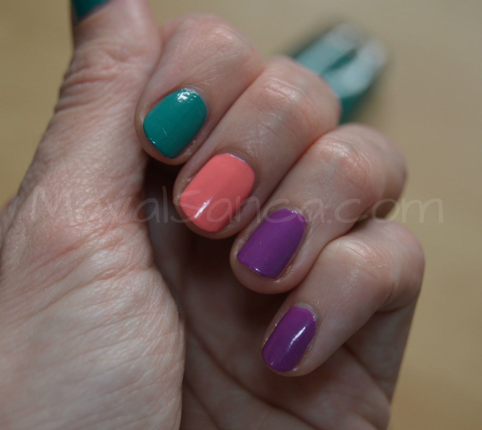 Y me gustó mucho la mezcla de colorido que a pesar de haber sido hecha al azar me resultó armoniosa.I'm anxious by nature, especially with makeup, so I use the three nail polishes at once.