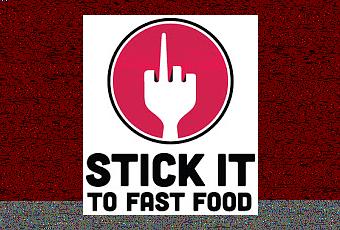 La comida rápida no es comida real. Fue diseñada por químicos de alimentos en batas blancas. Claro, a veces sabe bien pero todo es un truco. Si le pones suficiente sal, azúcar y grasa a cualquier cosa, va a saber bien. Las compañías de comida rápida se están haciendo ricos alimentándonos de basura. Y eso nos está engordando y enfermando. Este Noviembre, no comamos comida rápida y despídete de la comida rápida. Merecemos más que esto.Este es el lema/juramento de un grupo de estudiantes en Ontario, Canadá que decidieron que ya no es cool comer comida rápida y que hay que hacer algo. Empezaron por este grupo que se llama "Stick it to Fast Food" que promueve no comer en ninguno de estos lugares de comida rápida en el mes de Noviembre. No pizzas, no hamburguesas, no "tacos" (tipo Taco Bell), etc, etc.