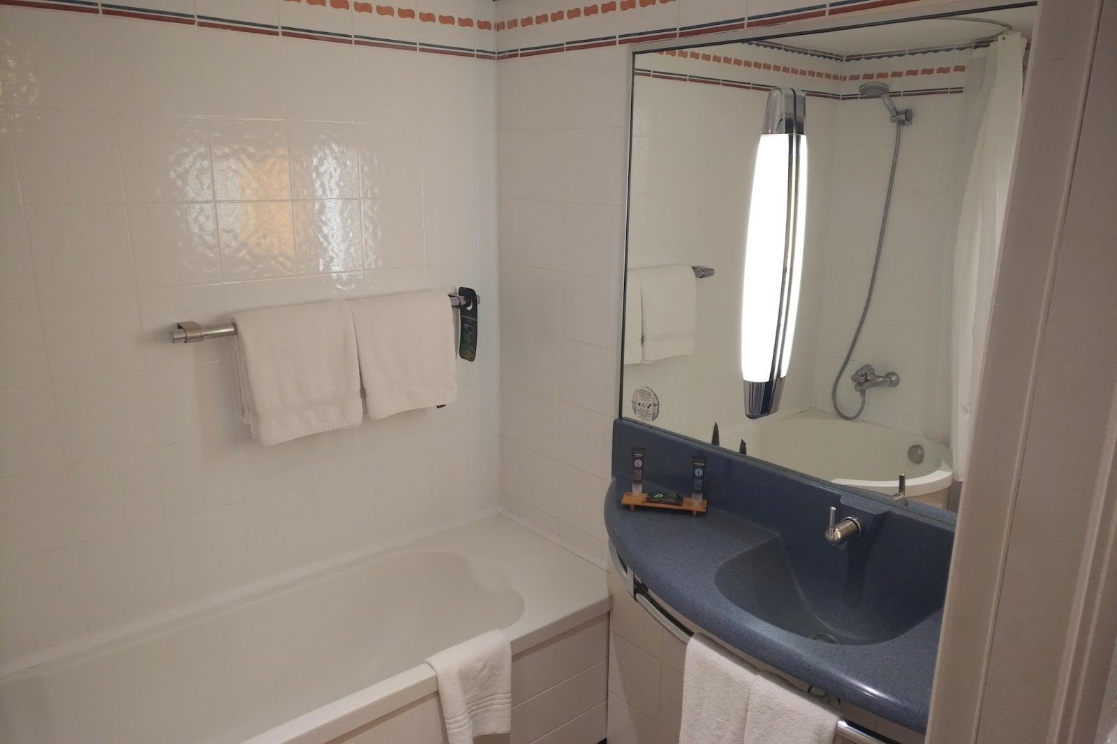 Enfrente de la puerta está la bañera. Algo sobreelevada, lo que puede hacer incómodo el acceso y deja el grifo excesivamente bajo para los que somos altos. Protegida por una antihigiénica cortina blanca que queda casi corta. La grifería sigue siendo tan roñosa como la del lavabo y además está puesta inclinada. Las juntas de la bañera con la pared y con el resto del alicatado están bastante dañadas. La temperatura de la ducha, que es una alcachofa normal de teléfono, es correcta, pero falta un punto de caudal y otro de presión. Una barra situada dentro de la bañera ofrece las dos toallas de ducha: blancas, limpias, mullidas y generosas.Por la mañana en un restaurante situado junto al bar y rodeado de cristaleras al jardín y la piscina del hotel se sirve un completo desayuno buffet atendido por una simpática camarera. El surtido es muy generoso: zumos, fruta cortada, embutidos, fiambres, quesos, platos calientes (huevos fritos, tortilla, revueltos, bacon, salchichas, chorizos, verduras...), distintos tipos de pan recién horneado, bollería crujiente, chocolates, galletas... y un café de máquina no muy malo. Ofrece además la posibilidad de preparar café para llevar en un vaso de cartón. Lástima que el espacio, quizá con luz demasiado artificial no sea excesivamente acogedor.