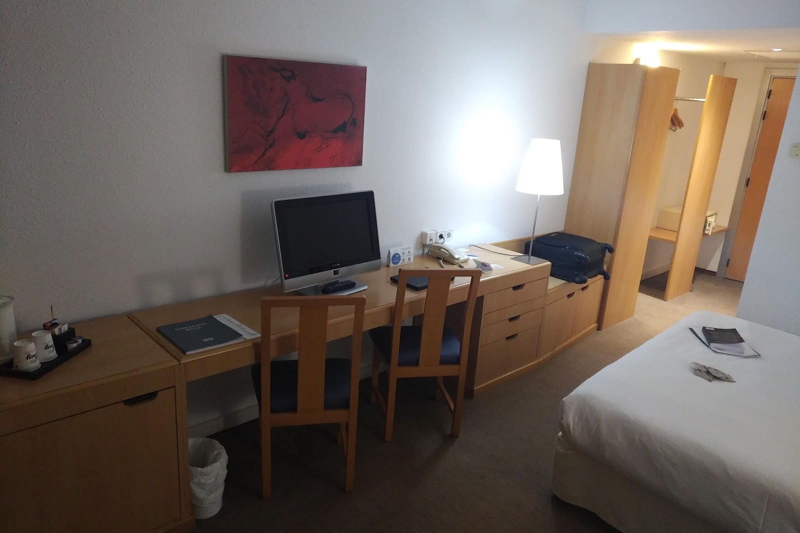 A la izquierda encontramos el display del aire acondicionado. Un botón de encendido y apagado, otro para la potencia y una rueda para la temperatura. No hace nada. Nada. Sólo ruido. Con el selector a 30 grados el aire sigue saliendo frío. A la derecha hay un larguísimo armario en madera blanca que enlaza un maletero generoso con un larguísimo escritorio. En él hay anclada una lámpara con pantalla de cristal blanco. Bajo ella, una cajonera con un lustrazapatos, unos folios y un set de costura. Encima del escritorio un enchufe disponible, el único en toda la habitación y el teléfono, que no está en la mesilla, ya que estas son demasiado pequeñas, una televisión plana y algunos folletos del hotel. Encima, colgando de la pared, un cuadro feo en rojo. Dos sillas, de enorme respaldo, algo incómodas para el trabajo y al final del escritorio, metido en un armario, el carísimo minibar. Junto a él, una papelera. Al final del escritorio, sobre el minibar se ofrece una bandeja de cortesía con un hervidor de agua un par de vasos de cartón y un surtido de cafés, infusiones y azúcares.