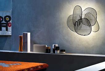 NUAGE - Diseñador: Philippe Nigro, 2012 Nuage, desarrollada con una concepción modular, es un cuadro luminoso tridimensional que vive tanto sola como en composiciones de luz articuladas, hasta amueblar toda una pared o un techo. Se inspira idealmente en el Optical Art, movimiento artístico de vanguardia de la década de los sesenta. Nuage es en efecto una lámpara de pared nunca igual a sí misma, que juega sobre la idea de la iluminación óptica, transformándose según el punto de vista de quien la observa.
