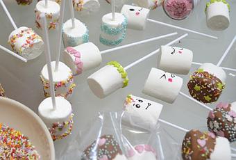 Necesitas:Nubes grandes blancasPalitos de piruletas Sprinkles de varios tiposUn pincel AguaChocolate con leche de coberturaBolsas de plásticoLazos de colores