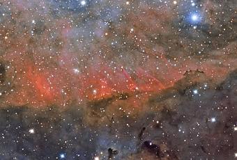 Abajo está Barnard 344, una nube de polvo oscuro rico en gas molecular frío. A la izquierda del centro de la imagen hay un espectacular muro de polvo y de gas hidrógeno rojo brillante que forma una línea. Mientras que el gas brillante rojo es indicativo de pequeñas nebulosas de emisión, las áreas teñidas de azul son nebulosas de reflexión osea, luz estelar reflejada por granos de polvo generalmente oscuros.
