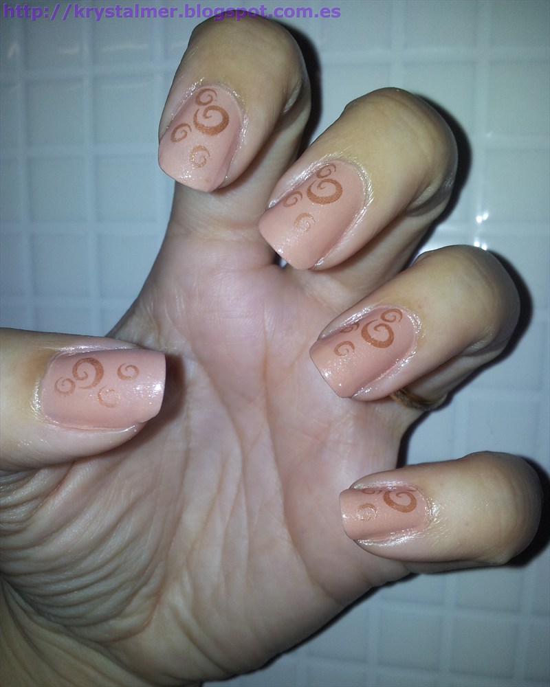 El estampado es de un color muy discreto, un marrón anaranjado muy clarito de Nagelin (bazares chinos). He estampado el dibujo de la placa Bundle Monster 224 sobre un fondo de Kiko (nº 220).