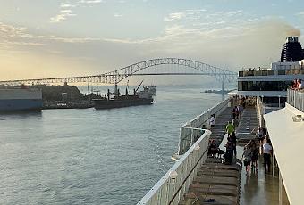 A medida que el barco dejaba el puerto, apenas podíamos contener nuestra emoción por las aventuras que nos esperaban, nos levantamos muy temprano y fuimos a la proa para ver desde la primera fila la aproximación al Puente de las Américas, entrada al Canal desde el Pacífico.
